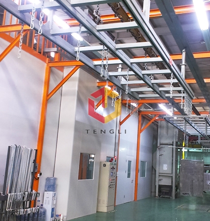 機(jī)床外殼涂裝線是借助于壓縮空氣將液態(tài)涂料(俗稱油漆)分散成漆霧微粒粘附在被涂物表面,而噴粉是借助于壓縮空氣拱粉在高壓靜電作用下分散成粉霧顆粒通過電場吸附在被涂物表面。
